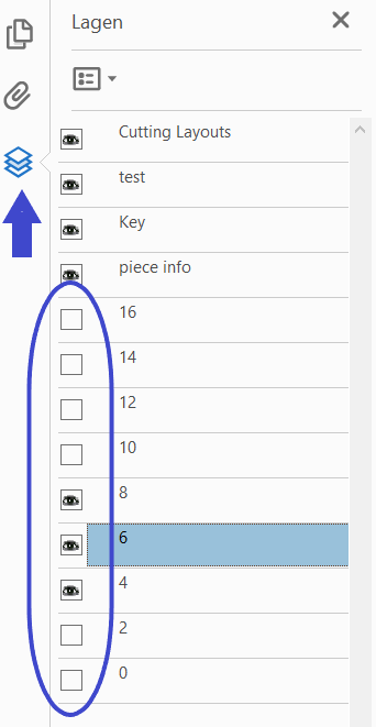 Once you downloaded and opened your pdf pattern file in a reader (I use Adobe), it is time to use the magic of layers! This is something I discovered recently and I feel quite stupid for not knowing… therefore I show it here 😉 In Adobe, there is a menu to the left, the bottom symbol will show you the layers in the file. Here, you can unclick everything you don’t need! By clicking the eye symbols in front of the sizes you are not intending to use, the will not show up on your printed file. Do not unclick everything at the top, you do want those. In the image you can see I just selected sizes 4-8.