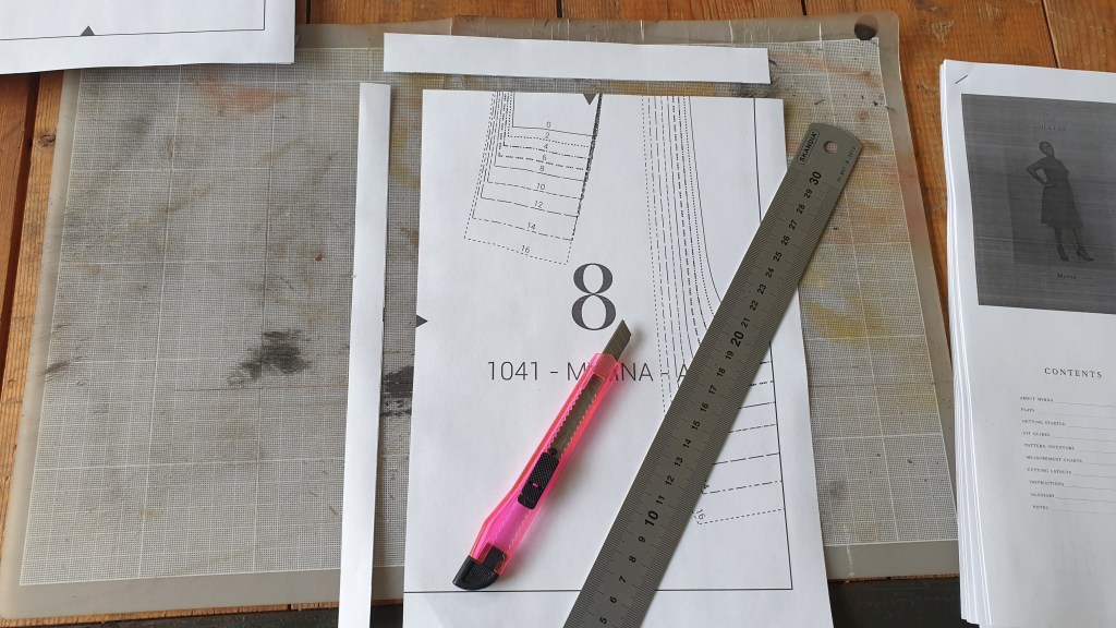 A few years back, I subscribed to Seamwork magazine, and this was also my first introduction to print-at-home PDF patterns. I remember putting them together correctly was not easy the first few times. Usually my pattern pieces would end up a little wavy, lines wouldn’t match up perfectly and most of all: it took a lot of time! I learned a lot over the past years and nowadays I manage to put together my PDF patterns quite fast and mostly flat. I thought I would share my technique today, so maybe it helps other people. I am going to make the Colette Myrna dress, an I will illustrate the process using this pattern.