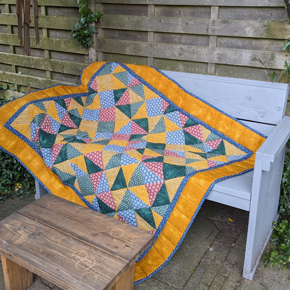 About 2 years ago I gifted one of my sisters a coupon for a quilt, made to her own preferences. The process of actually getting to sewing it was a slow one (picking colours, buying fabric, designing the pattern…) but last spring I got around putting all the pieces together, and the quilt above is the result!